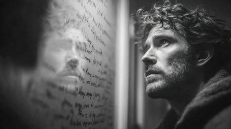 A man staring at a fogged bathroom mirror with faint words written on it, reflecting confusion and mystery.