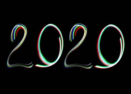 2020 happy new year symbol design. illustration with abstract colorful lights isolated on black background.