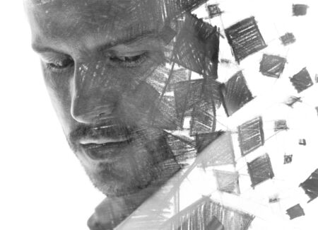 Close up portrait of a young woman featuring double exposure with glitch art elements