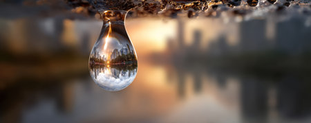 Golden Hour Reflection A Single Water Droplet Hangs, Mirroring City Lights at Sunset