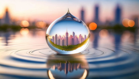 City skyline reflected in raindrop at sunrise showing calm water and blurred urban background with warm light