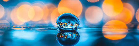This stunning image captures a water droplet poised on the surface, reflecting vibrant city lights with a bokeh effect, creating a serene and artistic visual experience.