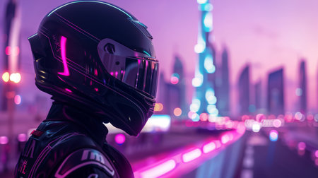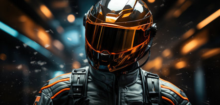 Portrait of a race car driver in full gear at the illuminated circuit, focus on safety and speed