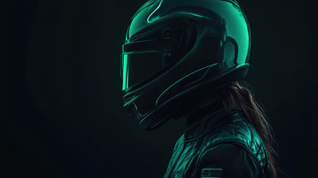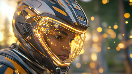 Figure in advanced space like helmet with illuminated visor on dark background, representing future, technology, and adventure