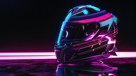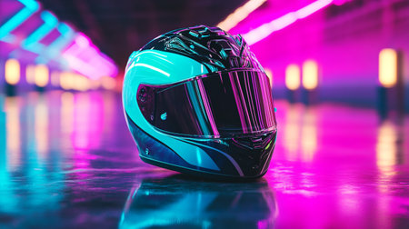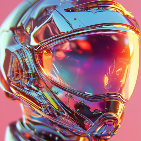 A close-up of a futuristic reflective helmet illuminated by neon lights. The vibrant colors and sleek design evoke a high-tech and sci-fi aesthetic.