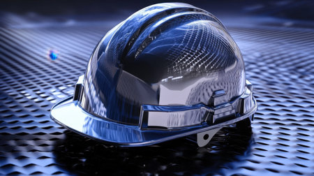 A shiny silver hard hat rests on a textured surface, reflecting light and showcasing modern design. Ideal for construction industry themes and safety equipment.