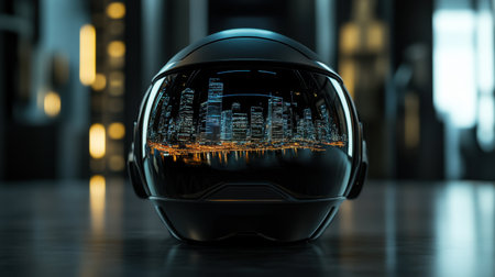 A sleek black helmet captures a stunning reflection of a vibrant urban cityscape at night, showcasing illuminated skyscrapers and modern architecture.