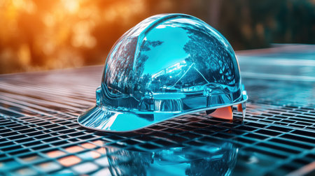 A shiny construction helmet rests on a metal surface, reflecting warm sunlight, showcasing safety equipment in an industrial environment. Ideal for themes of protection.