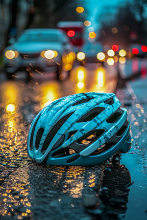 A solitary helmet lies on a slick, rain-soaked street under dim city illumination, capturing a moody scene of solitude and urban nocturnal ambiance.