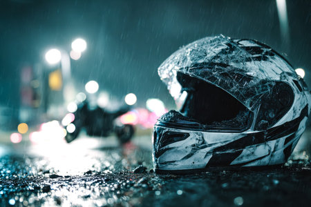 A shattered helmet lies abandoned on a glistening, rain-slick pavement beneath a moody, shadowed sky, evoking a sense of loss and quiet aftermath of a stormy night.
