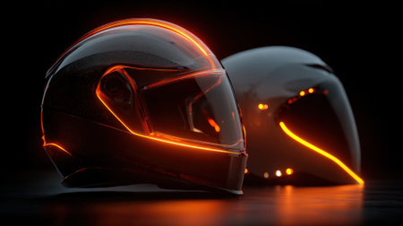 Two stylish motorcycle helmets with glowing edges rest together on a dark surface showing innovative design.