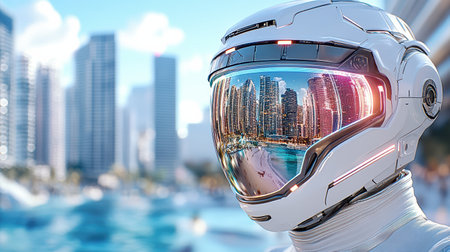 A futuristic cyberpunk helmet with mirrored visor reflecting cityscape