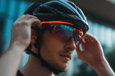 A cyclist prepares for a ride by adjusting a smart helmet and stylish eyewear outside a modern building. The city backdrop and warm light enhance the scene.