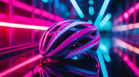 Bicycle helmet on a dark background with neon lights. 3d rendering