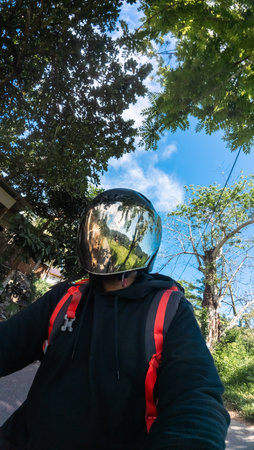 Motorcyclist with Reflective Helmet on a Sunny Day