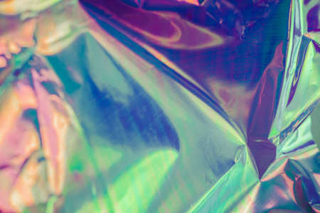 Defocused iridescent holographic background. Blurred colorful texture of wrinkled foil.