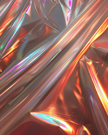 A captivating close-up of shimmering iridescent fabric displaying colorful reflections and gentle wrinkles. This image showcases intricate textures and a vibrant aesthetic perfect for various design projects.
