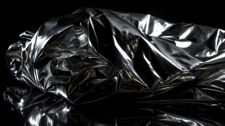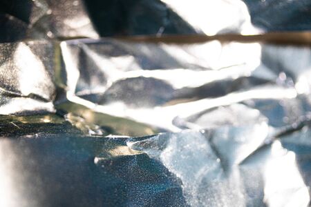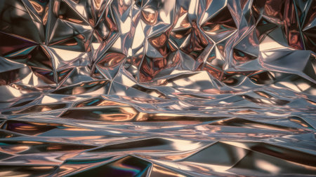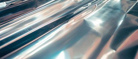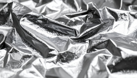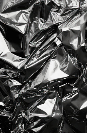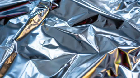 Reflective aluminum foil texture capturing light and shadow in intricate patterns