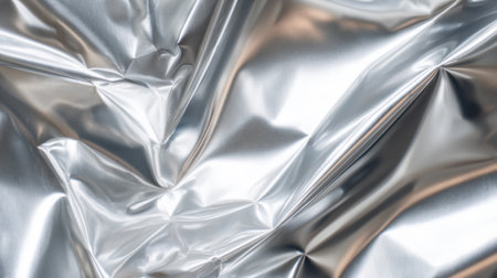 This close-up image showcases a shiny silver foil texture, featuring crinkles and creases that create an elegant, reflective surface perfect for backgrounds or creative projects.