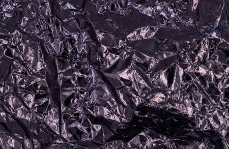Сrumpled aluminum silver surface with color neon lighting reflex, abstract background