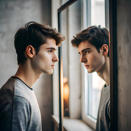 A young man stands facing a mirror. contemplating his reflection. The image captures a moment of introspection and self discovery. perfect for illustrating concepts of identity. self esteem. and personal growth.