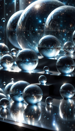 Beautifully lit spherical objects reflect captivating colors in a dark, high-tech environment.