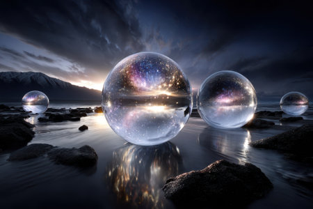 Glass spheres rest on rocky shore, reflecting the colorful night sky and distant mountains at twilight.