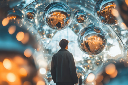 Individual admires a captivating installation with mirrored spheres in a bustling cityscape at sunset.