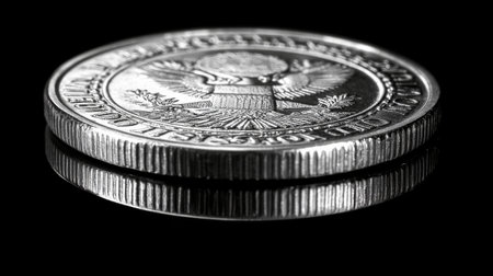 A close-up view of a silver coin featuring a historic figure, illuminated by light, highlighting its intricate design and texture against a black background.