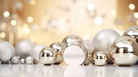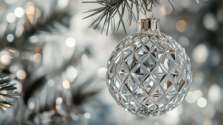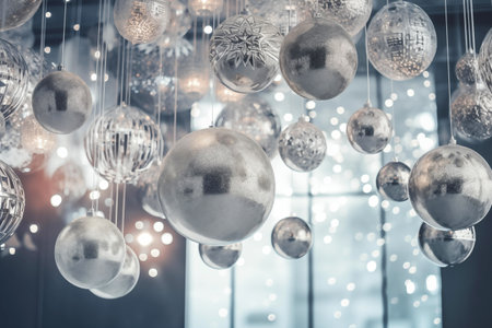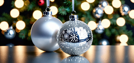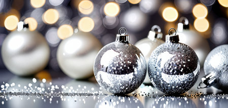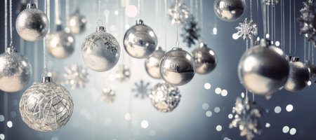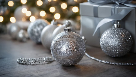 Beautiful silver Christmas ornaments set against a sparkling bokeh backdrop. Ideal for festive themes, holiday decorations, and winter celebrations, conveying warmth and joy.