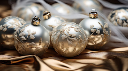 Silver christmas baubles on golden satin background, closeup