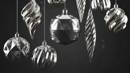 Stunning silver ornaments with intricate designs create a festive atmosphere, perfect for holiday decorations and seasonal celebrations in a cozy winter setting.