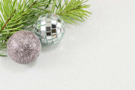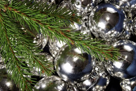 Background of New Year decorations: silver balls and silver fir branches. Close-up.