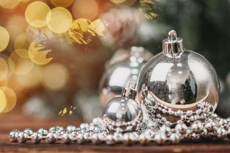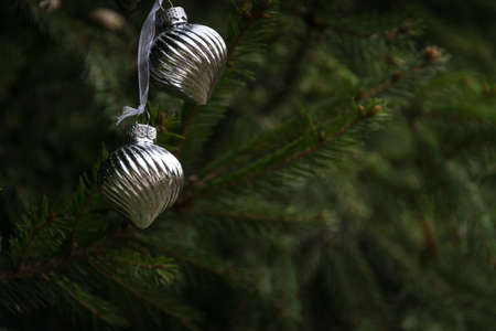 Silver christmas balls hanging on pine tree with bokeh background