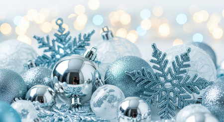 A close-up view of shiny silver and frosted blue Christmas tree ornaments and decorative snowflakes clustered together. The soft bokeh background suggests a warm, glowing festive atmosphere perfect for holiday celebrations and winter themes.