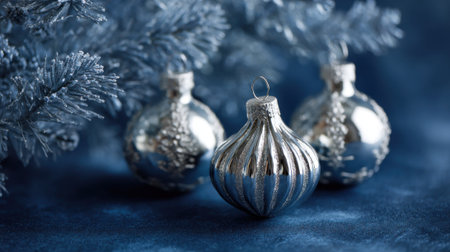 Three elegant silver ornaments are placed on a deep blue background. They are surrounded by frosty evergreen branches creating a festive and wintry scene.