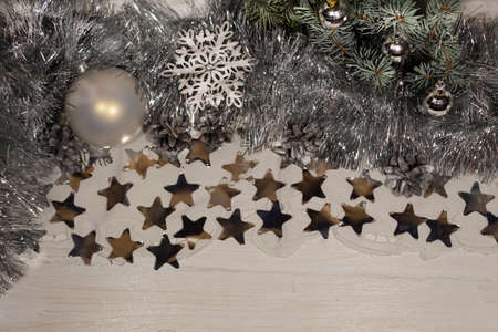 Fir-tree branches, silver tinsel, cones, snowflakes and balls lie on a white background. Shining silver stars are scattered nearby.