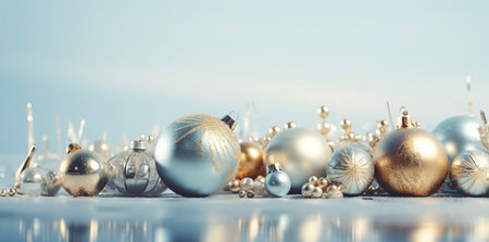 Elegant christmas ornaments with intricate designs and soft glowing lights on reflective surface. That the image is generated using AI.
