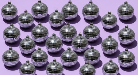 A grid of disco balls on a lavender background creates a festive, reflective pattern. Ideal for party themes, celebrations, and retro designs.