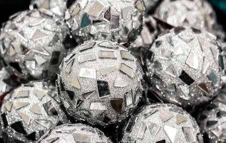 Christmas balls in gold and silver colors, close-up macro photo