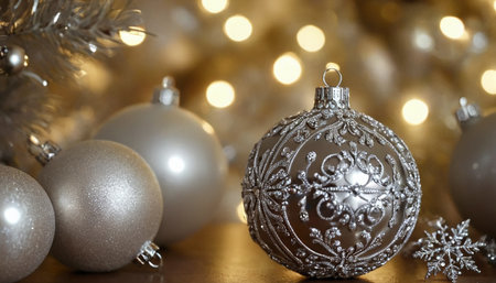 A festive and elegant close-up view of shimmering silver Christmas tree ornaments. The soft bokeh lights in the background add a magical and celebratory atmosphere, perfect for holiday decorations.