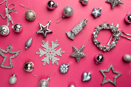 Christmas holidays composition with silver christmas decorations and snowflakes on pink background with copy space for your text