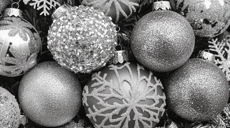 A stunning array of silver Christmas ornaments featuring various shapes and textures. Perfect for capturing the festive spirit and enhancing holiday decorations.