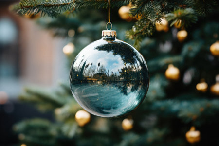Silver christmas ball hanging on christmas tree with bokeh background
