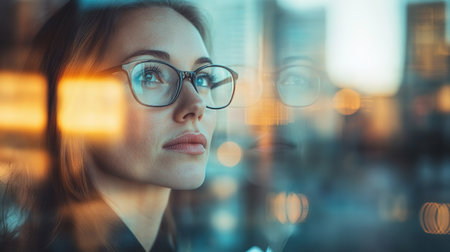 Businesswoman Contemplating Office Window Reflection