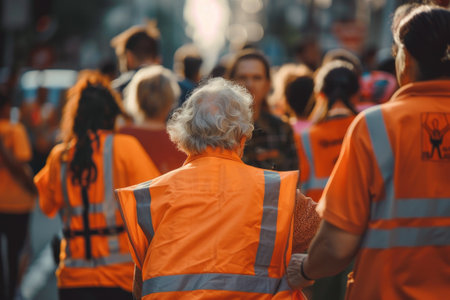 A heartwarming image of a group of volunteers helping an elderly person cross the street
