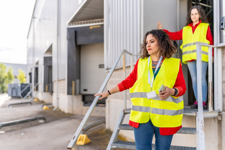 Two female colleagues wearing safety reflective yellow waistcoat walking out the entrance of a distribution warehouse