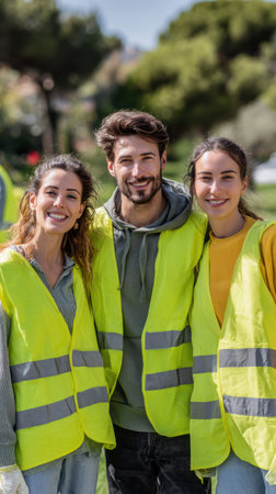 Three young adults in reflective vests pose together outdoors in a park, with lush greenery and trees visible in the background