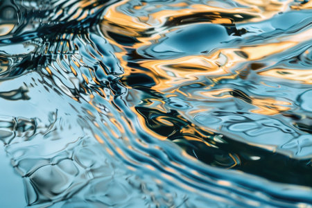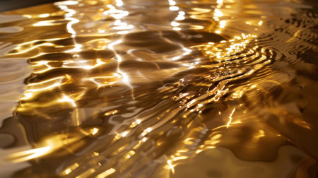 Close-up of transparent water surface with ripples and reflections, featuring silver veins. The sparkling golden light on the waters surface. Generated by artificial intelligence.