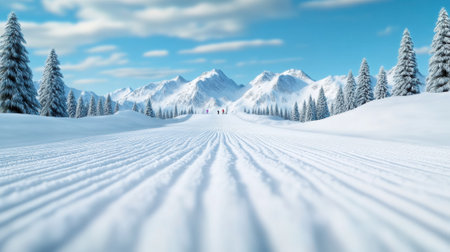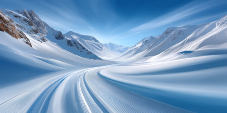 Snowy mountain valley with groomed ski trail winding through winter landscape blue sky full